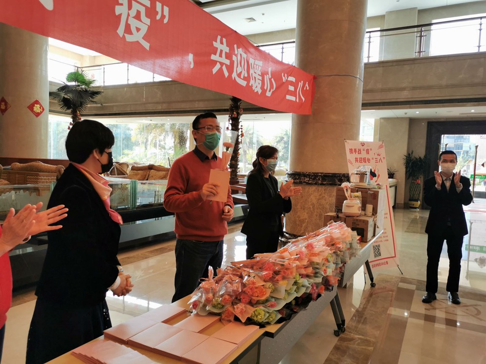 隨后總裁兼CEO孫亦農先生、首席財務官裴紅蘭女士、首席營銷官紀偉如女士、內審中心副總、銀鷺食品黨支部書記林麗霜女士為獲得一等獎的職工們送上鮮花、禮品。儀式簡單而溫馨,雖然大家都戴著口罩,但口罩擋不住她們的美麗,面對疫情,我們云擁抱、云互動,祝福是遠程的,心卻是如此貼近,這個3.8節過得比往年更有意義。