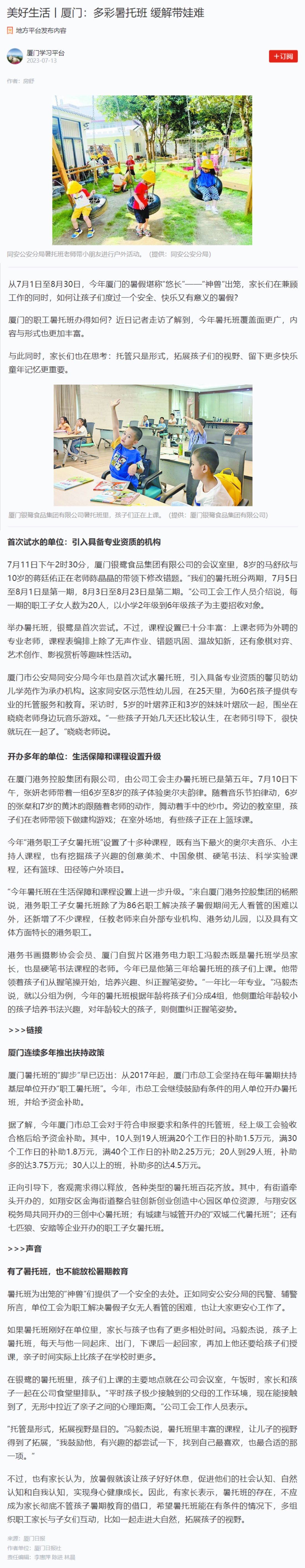 多彩暑托班,緩解帶娃難——記銀鷺食品集團(tuán)首次舉辦暑托班(來源:廈門日報(bào))發(fā)布日期:2023-07-20