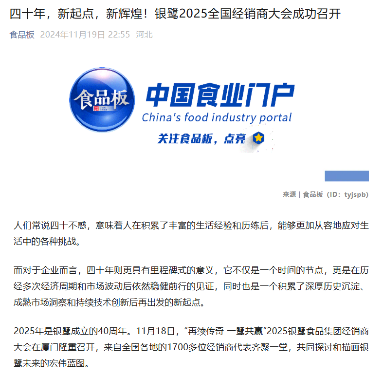 四十年,新起點,新輝煌!銀鷺2025全國經(jīng)銷商大會成功召開(來源:食品板)發(fā)布日期:2024-11-26